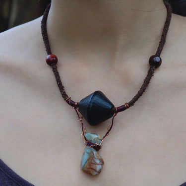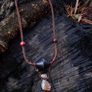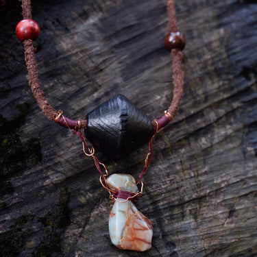 Material: Shoushan Stone, Wooden beads, Cowhide, Wax Rope, Copper