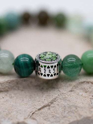 This Green Tara Many Treasures Protection Bracelet features a selection of natural gemstones, each carrying its own unique meaning of spiritual protection and wealth. The energy of each bead helps the wearer attract good fortune, protect wealth, and maintain inner peace. The gemstones, such as Green Agate, Green Phantom, and Phoenix Pine Stone, have powerful healing properties and are often used in meditation and emotional healing, helping to clear negative energy, balance the mind, and promote spiritual restoration.