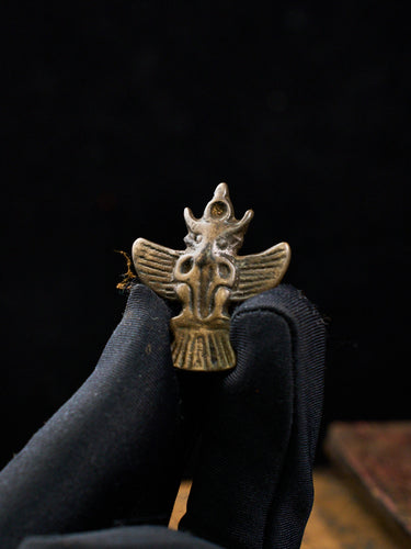 Sovereign sky power and fierce divine protection descend in this magnificent Thokcha sky iron Garuda altar object, a rare Tibetan sacred figurine cast from ancient meteorite iron of cosmic origin. Garuda is the supreme winged deity of Tibetan and Hindu tradition, the king of all birds whose vast wingspan spans the entire sky, his fierce energy believed to devour all serpentine negativity, poison, and obstacles that block the path of the wearer or their sacred space. The third eye at the crown of the forehead radiates all-seeing divine wisdom, perceiving threats across all dimensions simultaneously. Twin horns rise with fierce protective authority. Powerful outstretched wings frame the deity's face with dynamic sky energy, each feather rendered in precise relief detail. The open eagle beak channels the Garuda's legendary roar that silences all negative forces. A fan-shaped feathered robe grounds the figure in sacred Tibetan iconographic tradition. The warm bronze-gold Thokcha surface carries the natural patina of aged sky iron, its dense metallic texture radiating cosmic protective energy continuously. Place it on your altar or meditation space as a permanent guardian of supreme sky power and fierce divine protection.