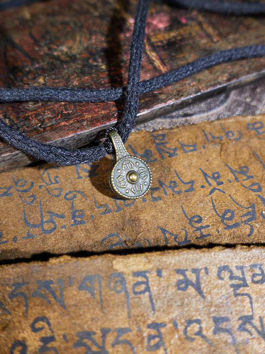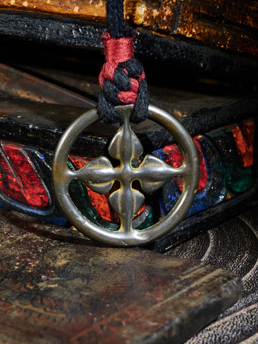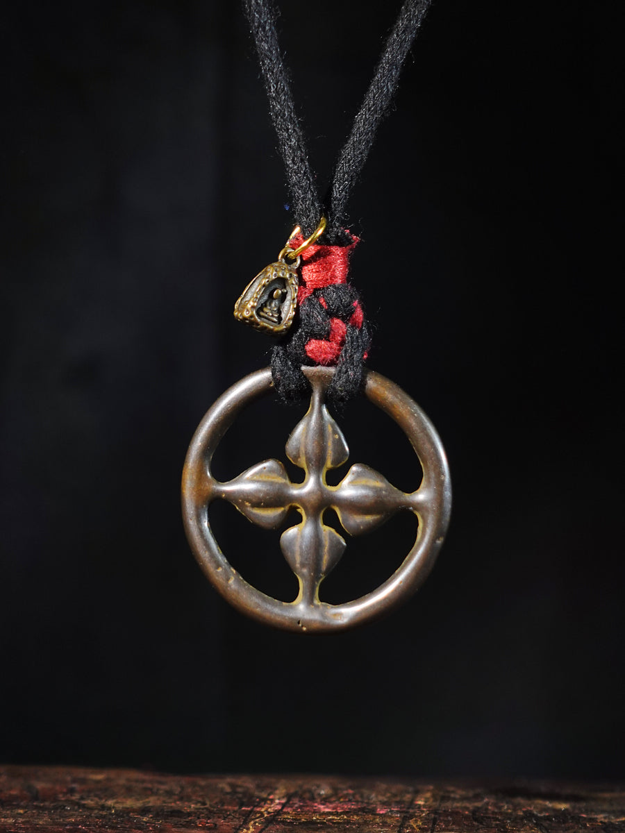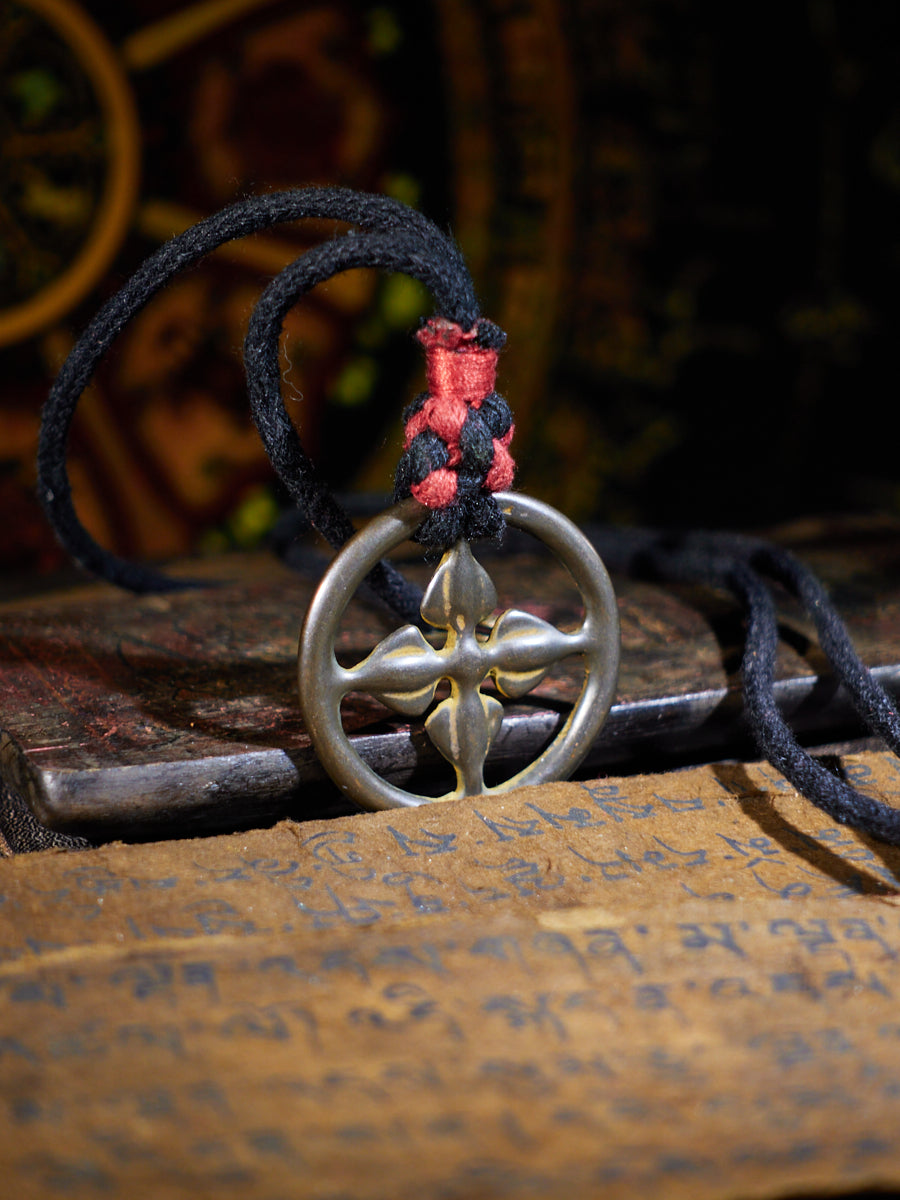 Forged from ancient Thokcha iron, this necklace centers a four-armed Vajra arranged in a crossing form. Its circular frame and symmetrical blades create a bold yet refined silhouette—simple at a glance, yet full of layered Tibetan character. The piece carries a quiet, powerful presence: dark metallic luster, smooth lines, and the unmistakable weight of ritual symbolism.