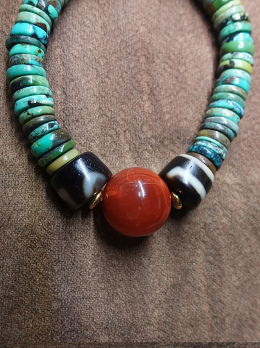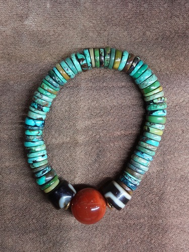 Design: This bracelet is crafted from natural turquoise beads, Dzi beads, and agate.