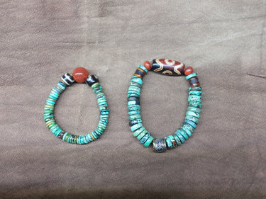 This exquisite bracelet is crafted from natural turquoise beads, Dzi beads, and agate. The turquoise beads are stacked to form the shape of a mani pile.