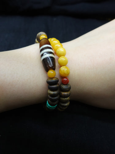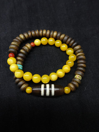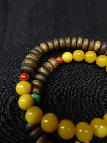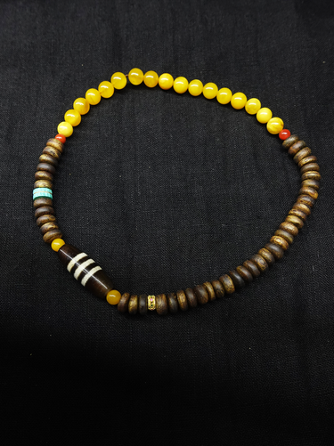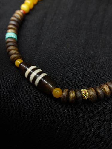 Design: This necklace combines amber, agarwood beads, and three-eyed Dzi beads.