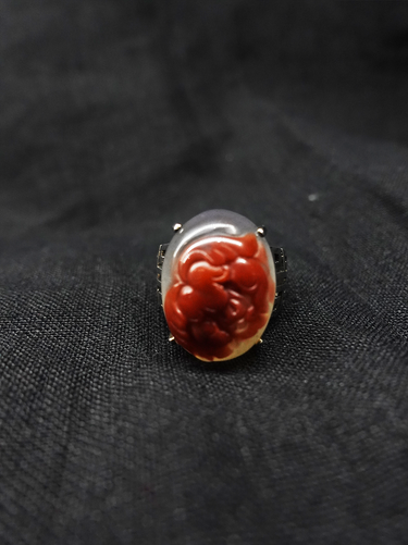 This ring features a carved peony-shaped South Red agate. South Red agate symbolises unwavering love and is often used as a token of affection between lovers. The peony symbolises passionate love and prosperity, and is commonly used in weddings and business openings. The exquisite peony carving adds an elegant cultural touch, highlighting the charm of traditional aesthetics.