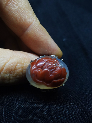 Design: This ring features a carved peony-shaped South Red agate.
