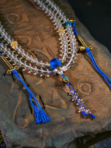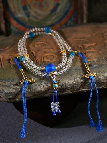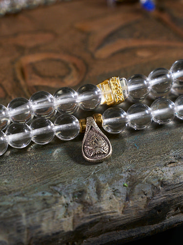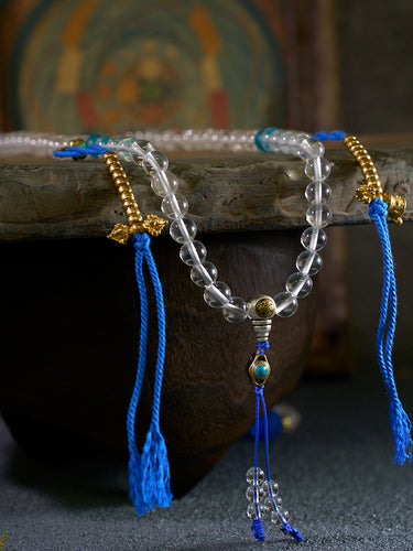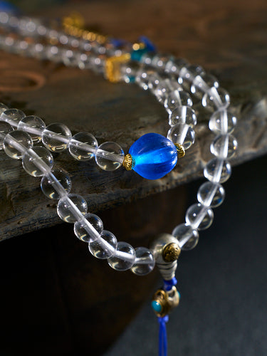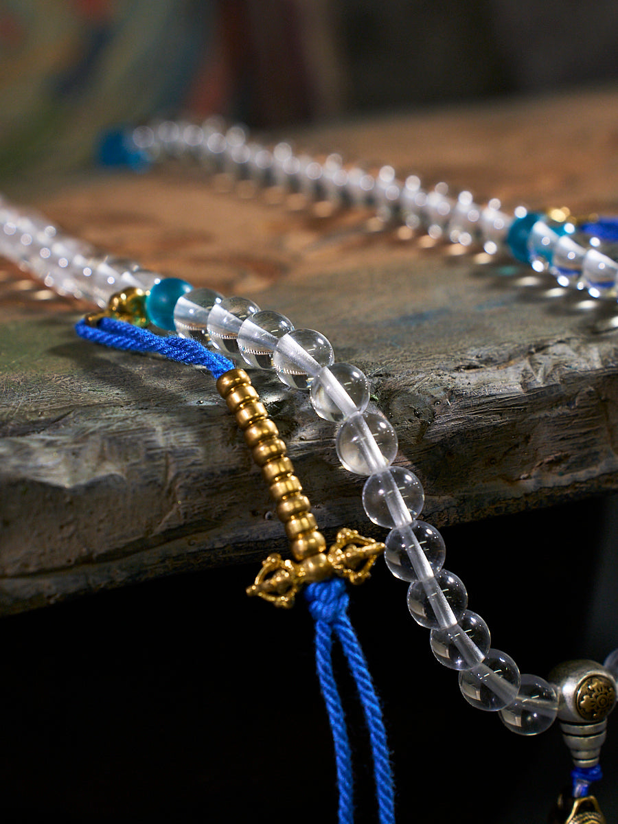 Harness the power of healing energy with the Kailash Energy 108 Bead Clear Quartz Mala Necklace. Crafted from pure clear quartz, known for its ability to amplify health and vitality, this mala features Tibetan antique glass accents and intricately designed Dorje (Vajra) beads, symbolizing strength and protection. Available in a basic round bead design or an upgraded luxury version, this necklace provides both style and spiritual wellness.