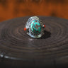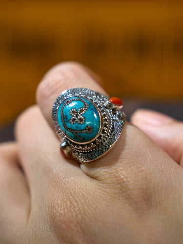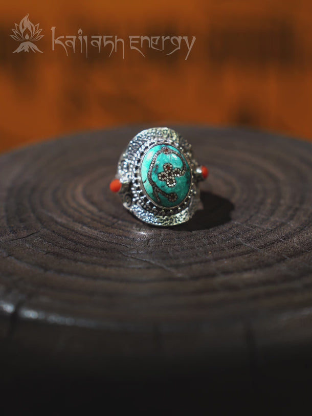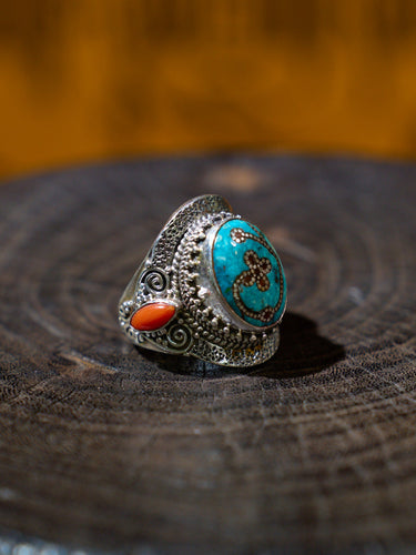 Sacred Harmony Ring with Turquoise and Red Coral in Sterling Silver – Talisman of Good Fortune