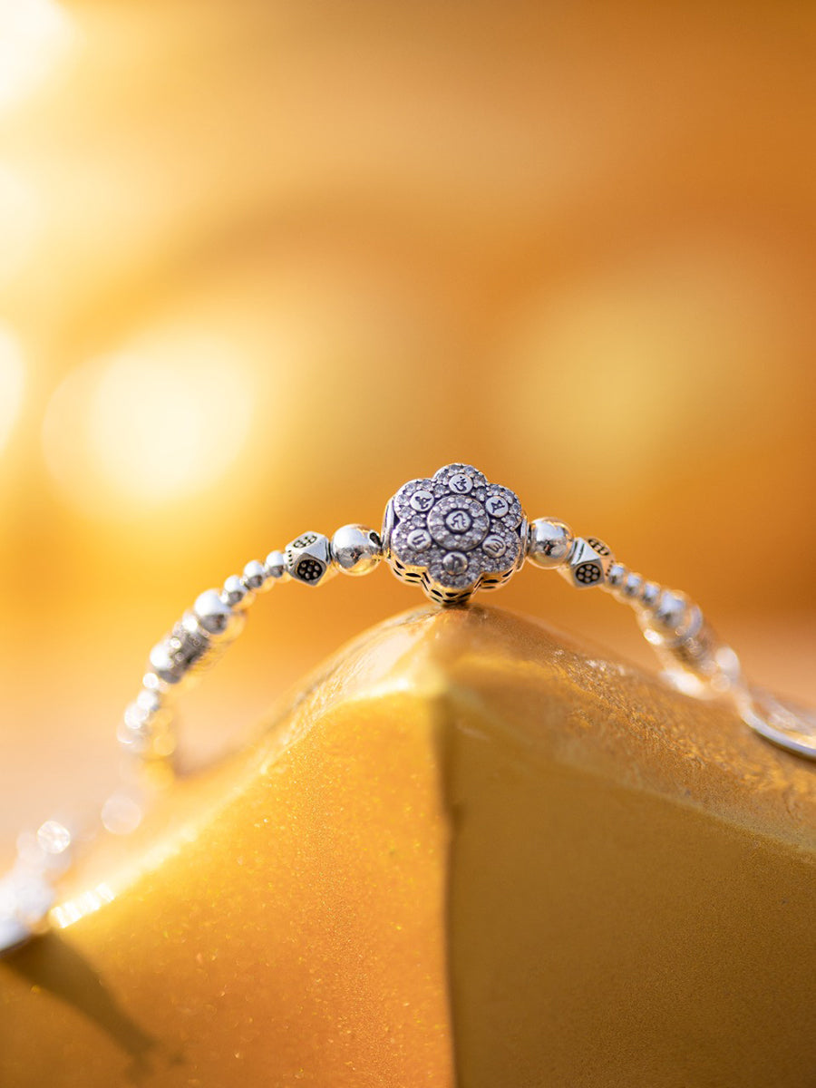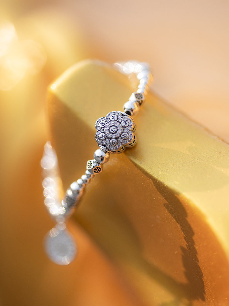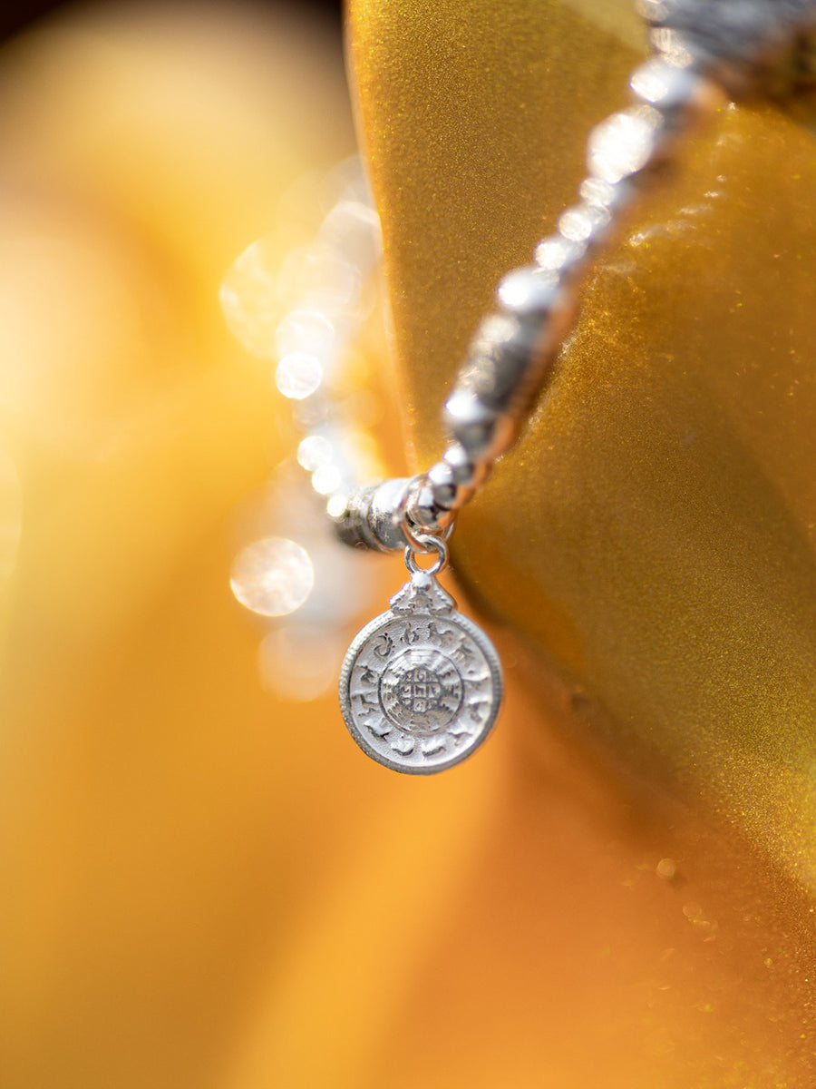 The Six-Syllable Mantra Silver Blessing Bracelet is inspired by the sacred mantra “Om Mani Padme Hum” — the Heart Mantra of Avalokiteśvara (Guanyin), embodying infinite compassion, wisdom, and divine protection. Each syllable carries profound spiritual power, purifying the body and mind, dissolving negativity, and nurturing inner peace. Meticulously handcrafted in 925 sterling silver, the bracelet features a lotus-shaped centerpiece engraved with the six sacred syllables, adorned with sparkling zircons that radiate serene brilliance. The surrounding silver beads are etched with auspicious patterns, representing harmony, protection, and fulfillment. Wearing this bracelet invokes Guanyin’s compassionate blessings, guiding the wearer toward clarity, serenity, and a life of virtue and wisdom.