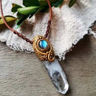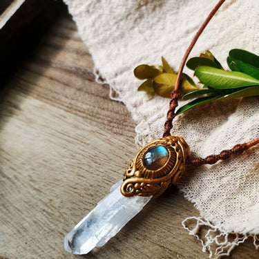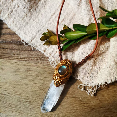 Tibetan Himalayan Clear Quartz Pendant with Labradorite for Purity and Spiritual Clarity