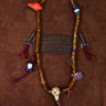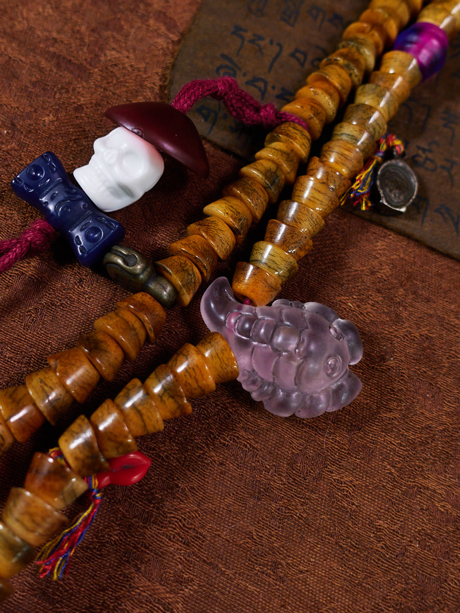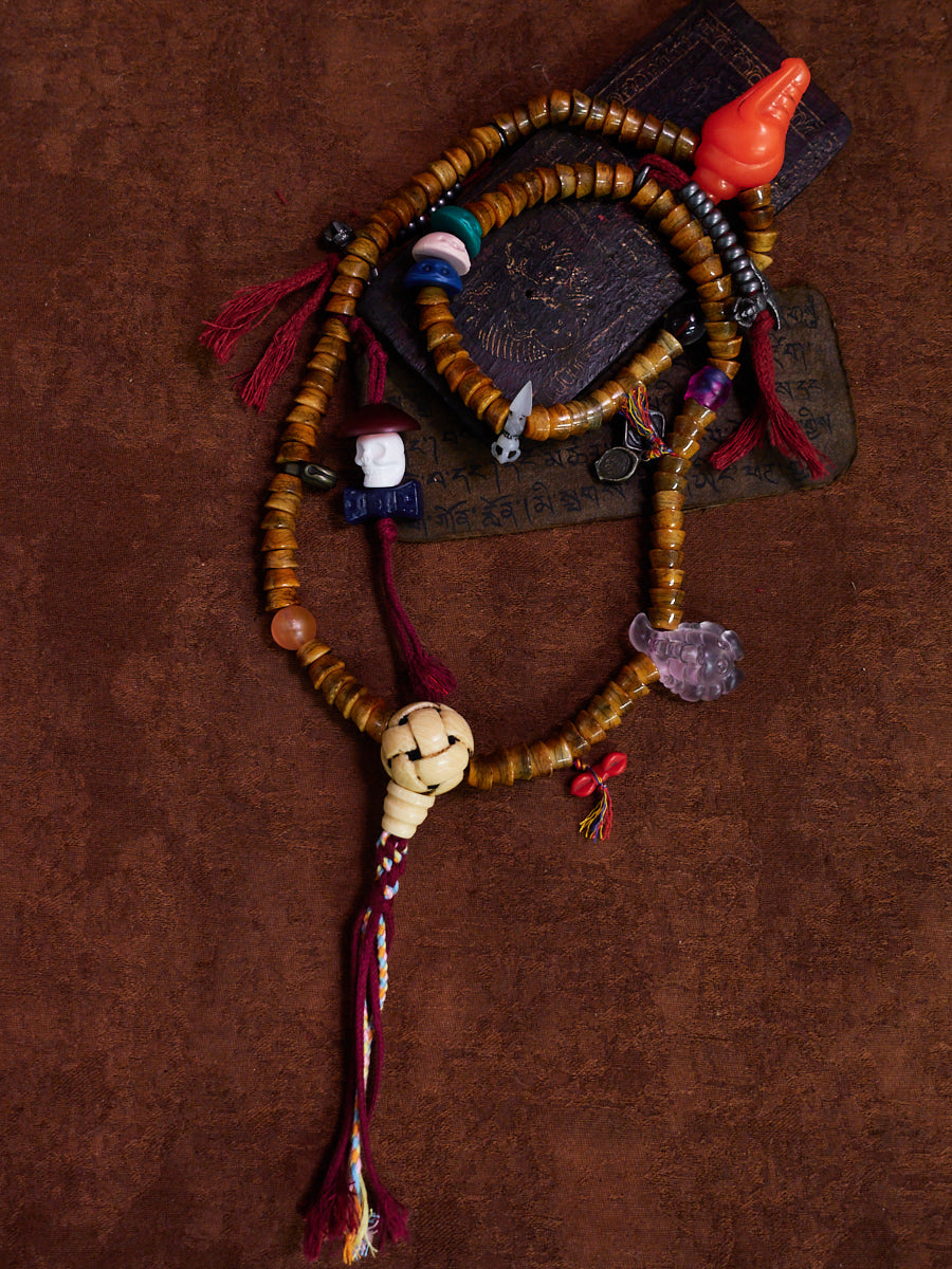 Shaped from warm, time-softened yak bone beads and adorned with celluloid charms and thokcha meteorite elements, this necklace carries the eclectic, storied energy of old-world Tibetan amulets. The irregular bead shapes, hand-tied tassels, and mixed symbolic pendants bring together the spirit of wandering monks, nomads, and ritual craftsmen—each part echoing a life spent between mountains, prayer flags, and wind-carved paths.
